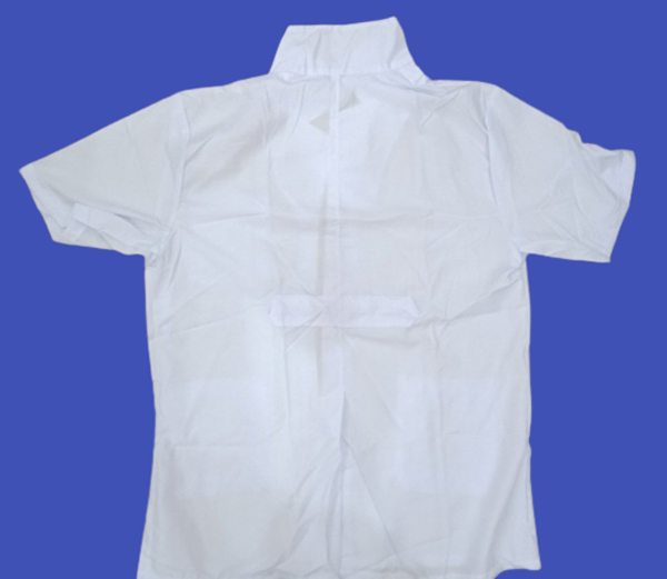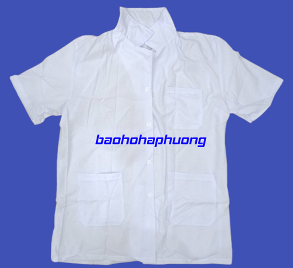 + Đặc điểm áo có màu trắng, cổ bẻ chữ K, cài cúc giữa, kiểu ngắn tay dáng suông.