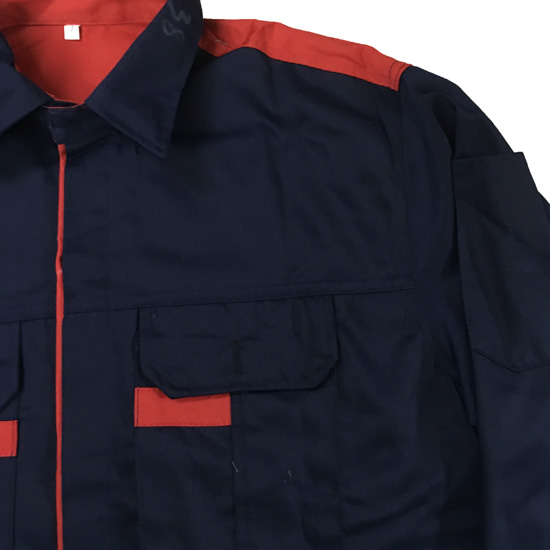 + Quần áo bảo hộ màu tím than phối đỏ được may bằng chất liệu vải 31 kaki liên doanh dày dặn, chất vải mát, thâm hút mồ hôi tốt.